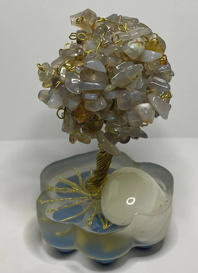 Minerály v koruně: acháty bílé vpletené do koruny stromu, o velikosti XS (do 1 cm)