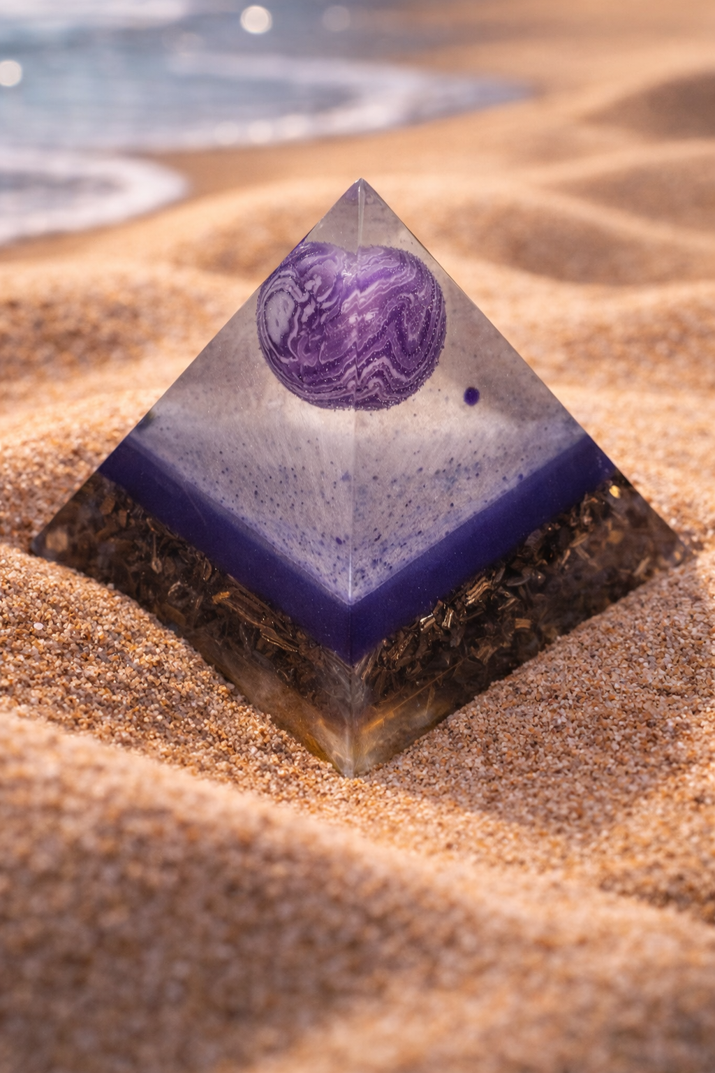 Pyramida je sestavená z achátu fialového a křišťálu. Achát je přírodní přibarvený minerál pocházející z Brazílie, křišťál je čistě přírodní pocházející z Brazílie. Křišťál je umístěn ve fialovobílém pruhu. Kovové špony přidány pro tříštění negativní energie. Jedná se o orgonit, síla ochrany a očisty je 5 metrů v kruhu. Obsahuje UV pryskyřici. Pyramida váží cca 63 g, výška pyramidy je cca 4,9 cm, a široká je cca 4,9 cm. Ručně vyrobená. Nevystavujte přímému slunci.