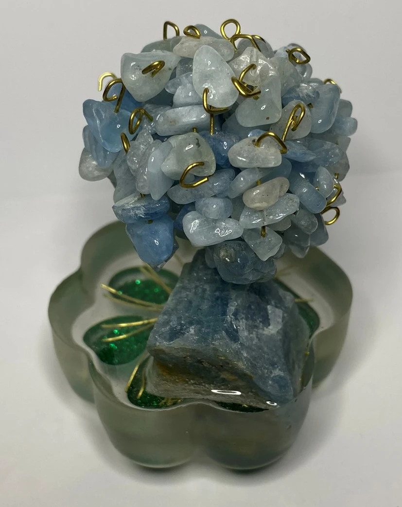 Minerály v koruně: akvamaríny modré vpletené do koruny stromu, o velikosti XS (do 1