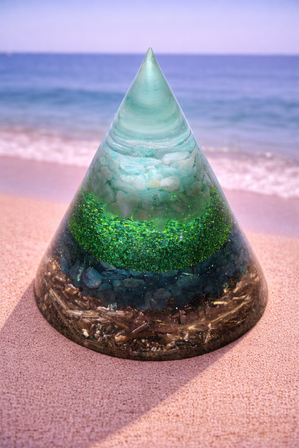 je sestaven jako orgonit, má dosah ochrany a očisty 6 metrů.