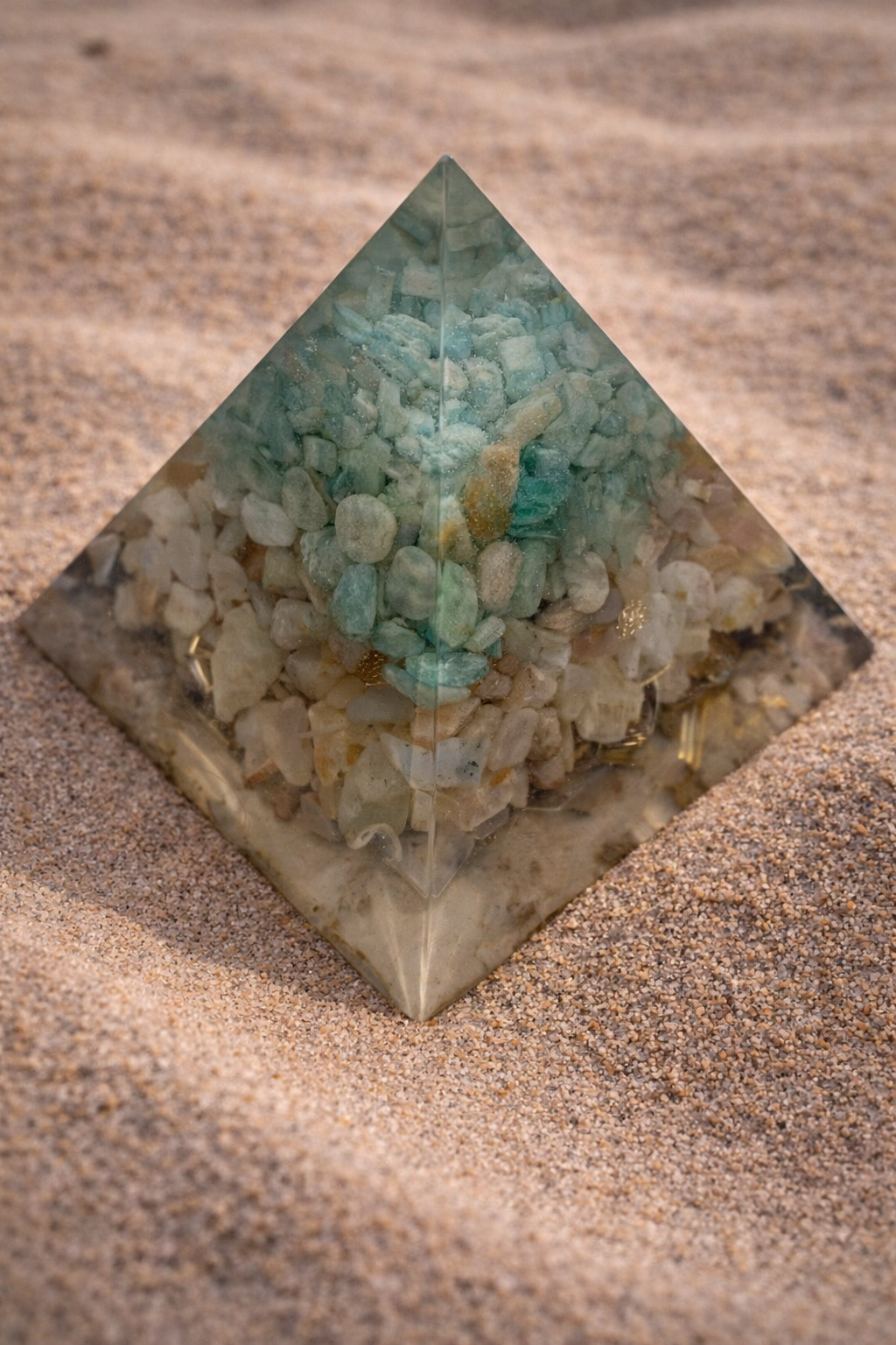 Pyramida je sestavená z amazonitu zeleného, opálu a křišťálu. Amazonit zelený je čistě přírodní minerál pocházející z Brazílie, opál růžový je čistě přírodní minerál pocházející z Peru, křišťál čistě přírodní pocházející z Brazílie. Kovové špony přidány pro tříštění negativní energie. Jedná se o orgonit, síla ochrany a očisty je 4 metry v kruhu. Obsahuje UV pryskyřici. Pyramida váží cca 35 g, výška pyramidy je cca 4 cm, a široká je cca 3,9 cm. Ručně vyrobená. Nevystavujte přímému slunci.