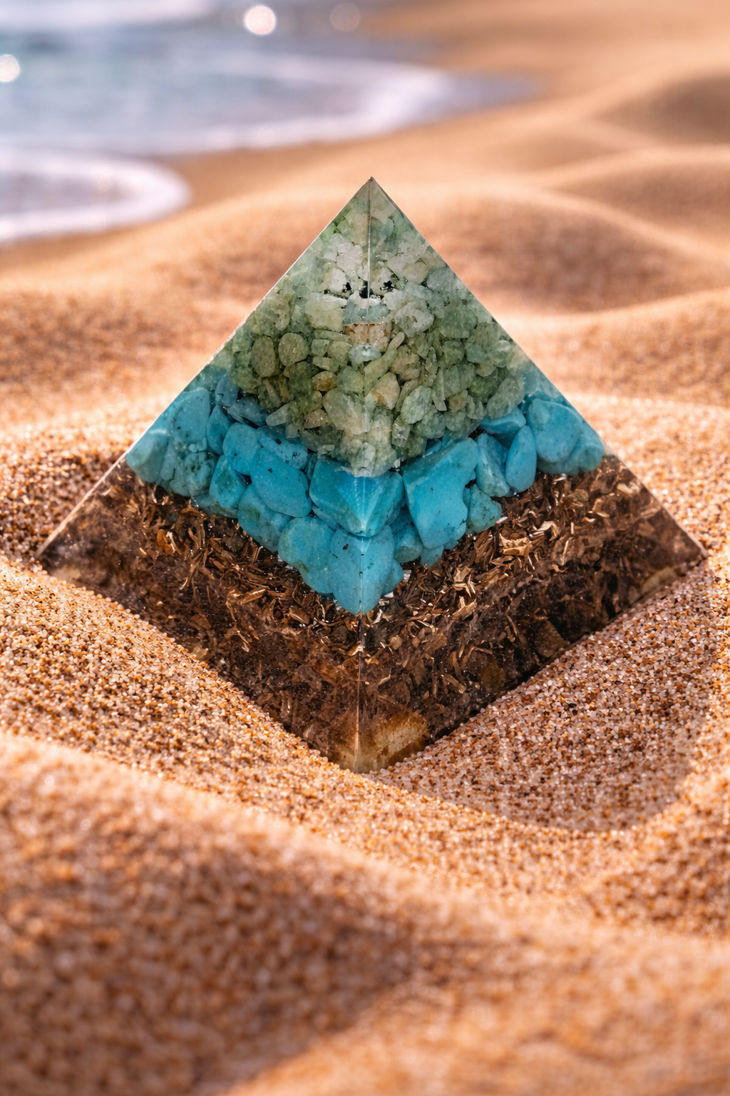 Pyramida je sestavená z amazonitu, tyrkenitu a křišťálu. Amazonit je přírodní přibarvený minerál pocházející z Brazílie, tyrkenit je přírodní howlit přibarvený, křišťál je čistě přírodní pocházející z Brazílie. Křišťál je umístěn mezi tyrkenitem. Kovové špony přidány pro tříštění negativní energie. Jedná se o orgonit, síla ochrany a očisty je 5 metrů v kruhu. Obsahuje UV pryskyřici. Pyramida váží cca 77 g, výška pyramidy je cca 4,9 cm, a široká je cca 4,9 cm. Ručně vyrobená. Nevystavujte přímému slunci.