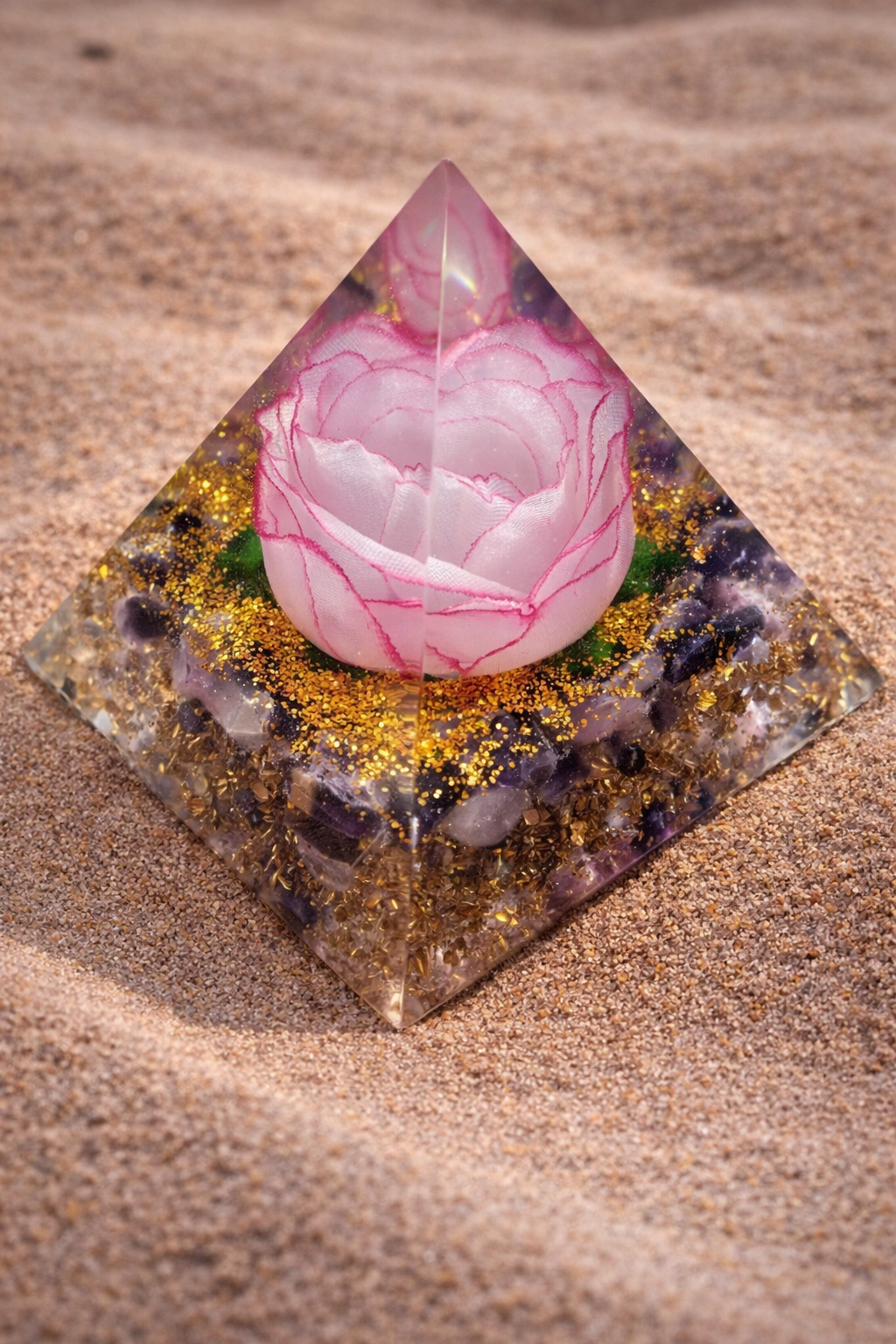 Pyramida je sestavená z ametystu a křišťálu. Ametyst je čistě přírodní minerál pocházející z Brazílie, křišťál je čistě přírodní pocházející z Brazílie. Kovové špony přidány pro tříštění negativní energie. Látková růže symbolizující čistotu a lásku. Metalická zlatá fólie pro hojnost. Jedná se o orgonit, síla ochrany a očisty je 6 metrů v kruhu. Obsahuje UV pryskyřici. Pyramida váží cca 100 g, výška pyramidy je cca 5,8 cm, a široká je cca 6,2 cm. Ručně vyrobená. Nevystavujte přímému slunci.