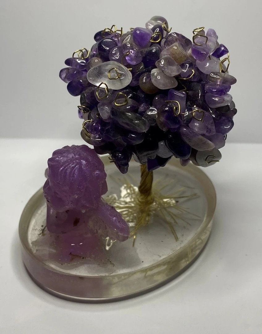 Minerály v koruně: ametysty vpletené do koruny stromu, o velikosti XS (do 1 cm),