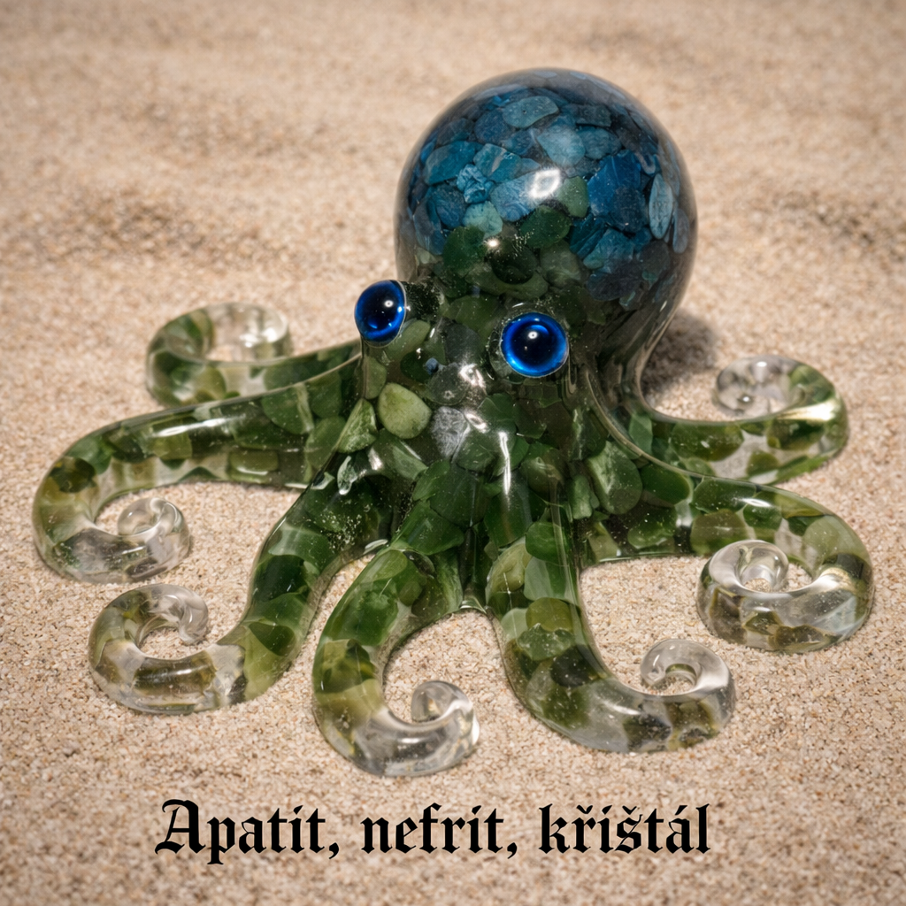 Chobotnice je sestavená z apatitu modrého, nefritu zeleného a křišťálu. Apatit modrý je čistě přírodní, pochází z Madagaskaru, nefrit zelený přírodní pochází z Kanady, křišťál čistě přírodní pocházející z Brazílie. Chobotnice má akrylové oči. Zalitá je v UV pryskyřici. Chobotnice váží cca 139 g, výška chobotnice je cca 4,5 cm, a široká je cca 10,2 x 9,3 cm. Ručně vyrobená. Nevystavujte přímému slunci.