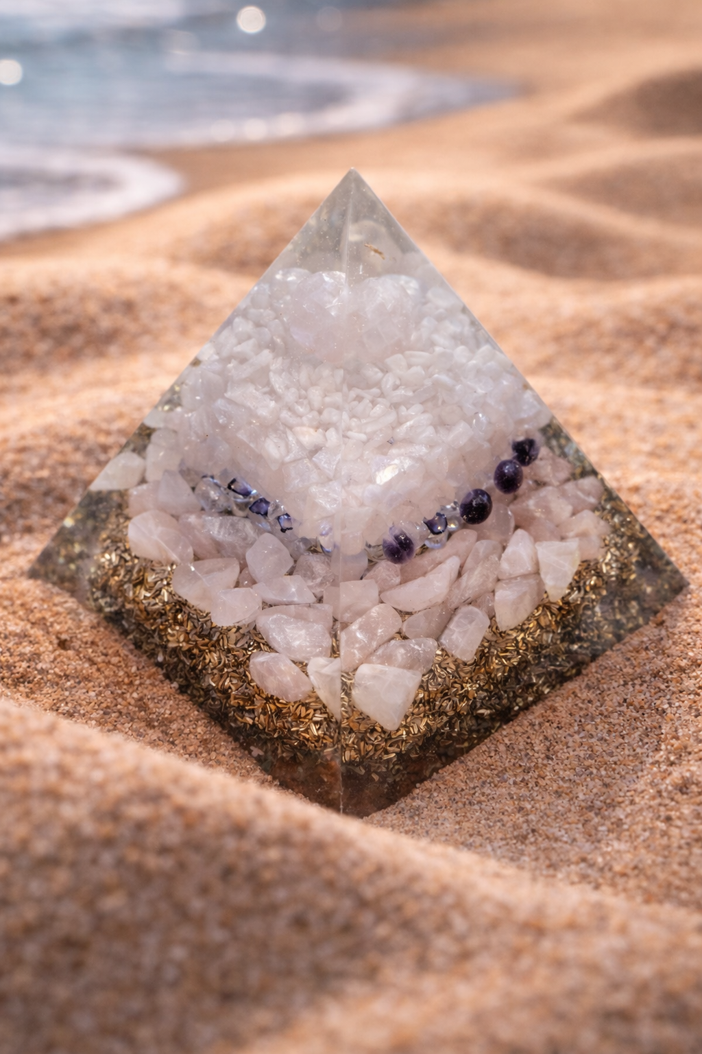 Pyramida je sestavená z ametystu, růženínu a křišťálu. Ametyst je čistě přírodní minerál pocházející z Brazílie, růženín je čistě přírodní minerál pocházející z Brazílie, křišťál je čistě přírodní pocházející z Brazílie. Kovové špony přidány pro tříštění negativní energie. Orgonit je sestaven na příchod lásky, a odchod toho, co v lásce brání. Na to slouží jižní strana, která má mírnou vyboulinku (úmyslně je to takto vytvořeno). Obsahuje křišťálový lotus feng-shui. Jedná se o orgonit, síla ochrany a očisty je 15 metrů v kruhu. Obsahuje UV pryskyřici. Pyramida váží cca 1,45 kg, výška pyramidy je cca 16 cm, a široká je cca 14,4 cm. Ručně vyrobená. Nevystavujte přímému slunci.