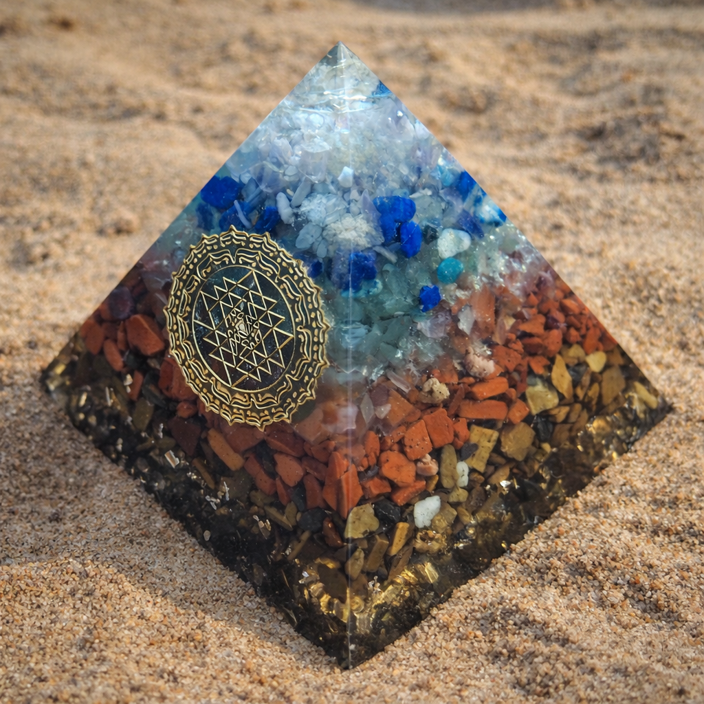 Pyramida je sestavená z tygřího oka, jaspisu červeného, karneolu, avanturínu zeleného, sodalitu, lazuritu, ametystu a křišťálu. Tygří oko je čistě přírodní minerál pocházející z Jihoafrické republiky, jaspis červený je čistě přírodní minerál pocházející z Jihoafrické republiky, karneol je čistě přírodní minerál pocházející z Malawi, avanturín zelený je čistě přírodní minerál pocházející ze Zimbabwe, sodalit je čistě přírodní minerál pocházející z Namíbie, lazurit je čistě přírodní minerál pocházející z Afghánistánu, ametyst je čistě přírodní minerál pocházející z Brazílie, a křišťál je čistě přírodní pocházející z Brazílie. Kovové špony přidány pro tříštění negativní energie, přidaná zlatá fólie a mosazný symbol Srí Jantry. Jedná se o orgonit, síla ochrany a očisty je 5 metrů v kruhu. Obsahuje UV pryskyřici. Pyramida váží cca 76 g, výška pyramidy je cca 5 cm, a široká je cca 4,7 cm. Ručně vyrobená. Nevystavujte přímému slunci.