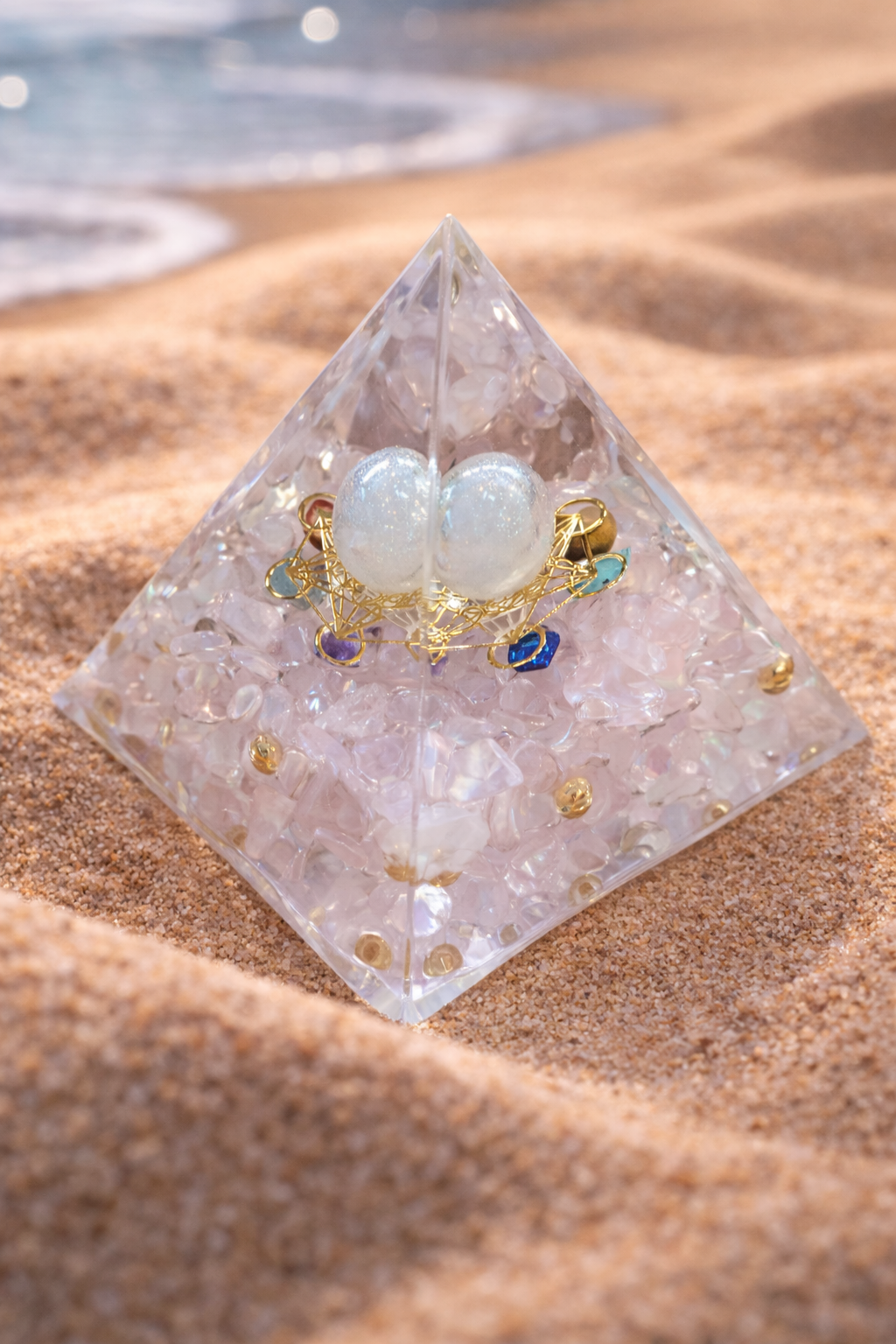 Pyramida je sestavená z růženínu, čakrových mini minerálků a křišťálu. Růženín je čistě přírodní minerál pocházející z Brazílie, ostatní minerálky jsou čistě přírodní z různých koutů světa, křišťál je čistě přírodní pocházející z Brazílie. Kovové kuličky přidány pro tříštění negativní energie. Mosazný symbol archanděla Metatrona. Jedná se o orgonit, síla ochrany a očisty je 5 metrů v kruhu. Obsahuje UV pryskyřici. Pyramida váží cca 62 g, výška pyramidy je cca 5,1 cm, a široká je cca 4,9 cm. Ručně vyrobená. Nevystavujte přímému slunci.