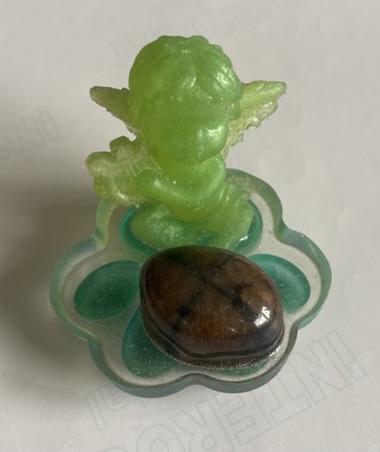 třpytky. Anděl je z pryskyřice Resin Italy, zelené barvy.