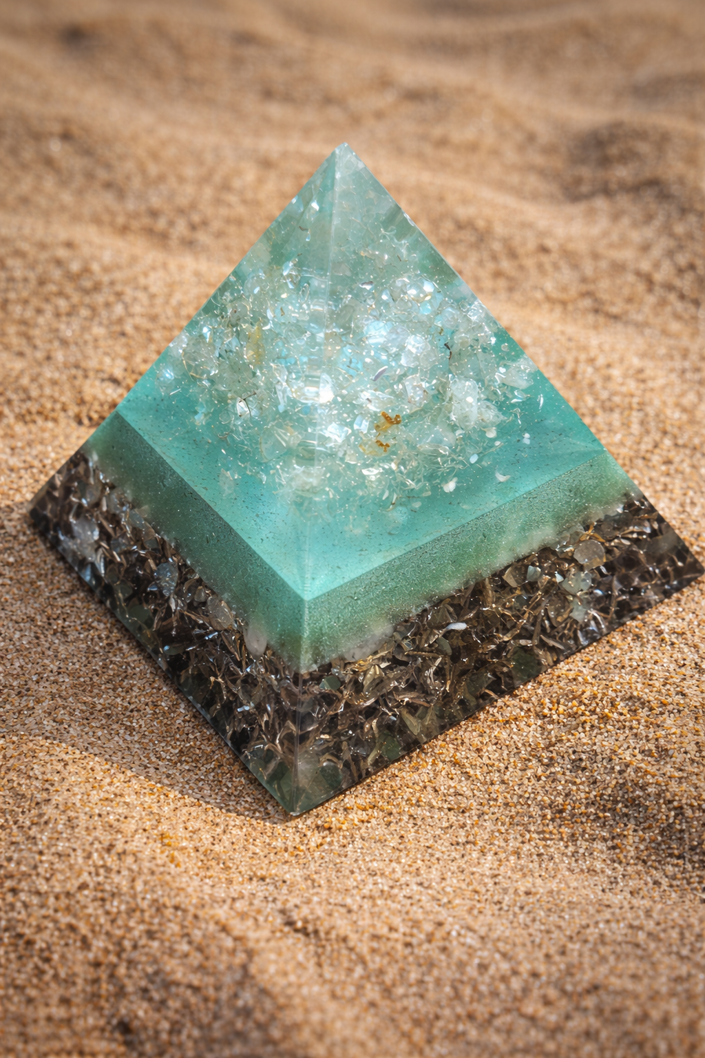 Pyramida je sestavená z citrínu, olivínu a křišťálu. Citrín je přírodní minerál vypalovaný pocházející z Brazílie, olivín je čistě přírodní minerál pocházející ze Srí Lanky, křišťál je čistě přírodní pocházející z Brazílie. Kovové špony přidány pro tříštění negativní energie. Jedná se o orgonit, síla ochrany a očisty je 5 metrů v kruhu. Obsahuje UV pryskyřici. Pyramida váží cca 70 g, výška pyramidy je cca 5 cm, a široká je cca 4,9 cm. Ručně vyrobená. Nevystavujte přímému slunci.