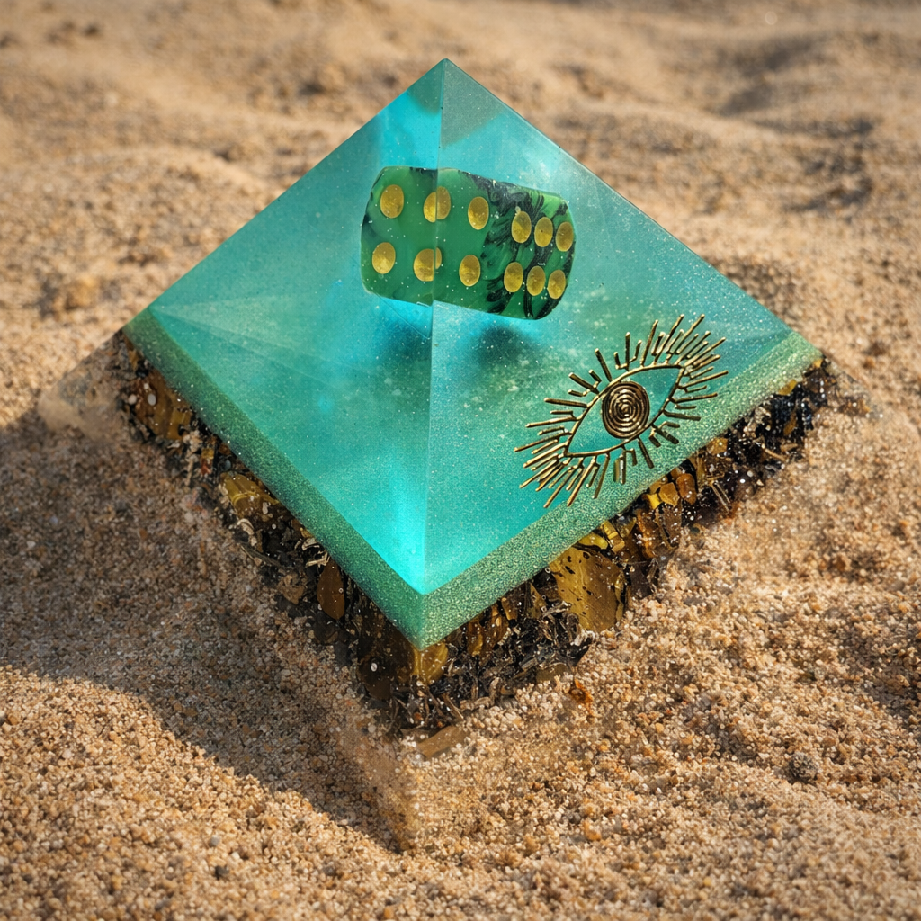 Pyramida je sestavená z tygřího oka a křišťálu. Tygří oko je čistě přírodní minerál pocházející z Jihoafrické republiky, křišťál je čistě přírodní pocházející z Brazílie. Na vrcholu je kostka z pryskyřice, do které je vložen malý křišťál, která je od tygřího oka oddělena zelenkavou barvou. Kovové špony přidány pro tříštění negativní energie. Doplněno o mosazný symbol Božího oka. Jedná se o orgonit, síla ochrany a očisty je 9 metrů v kruhu. Obsahuje UV pryskyřici. Pyramida váží cca 300 g, výška pyramidy je cca 6,4 cm, a široká je cca 9,6 cm. Ručně vyrobená. Nevystavujte přímému slunci. Orgonit vhodný pro podnikatele nebo hráče.