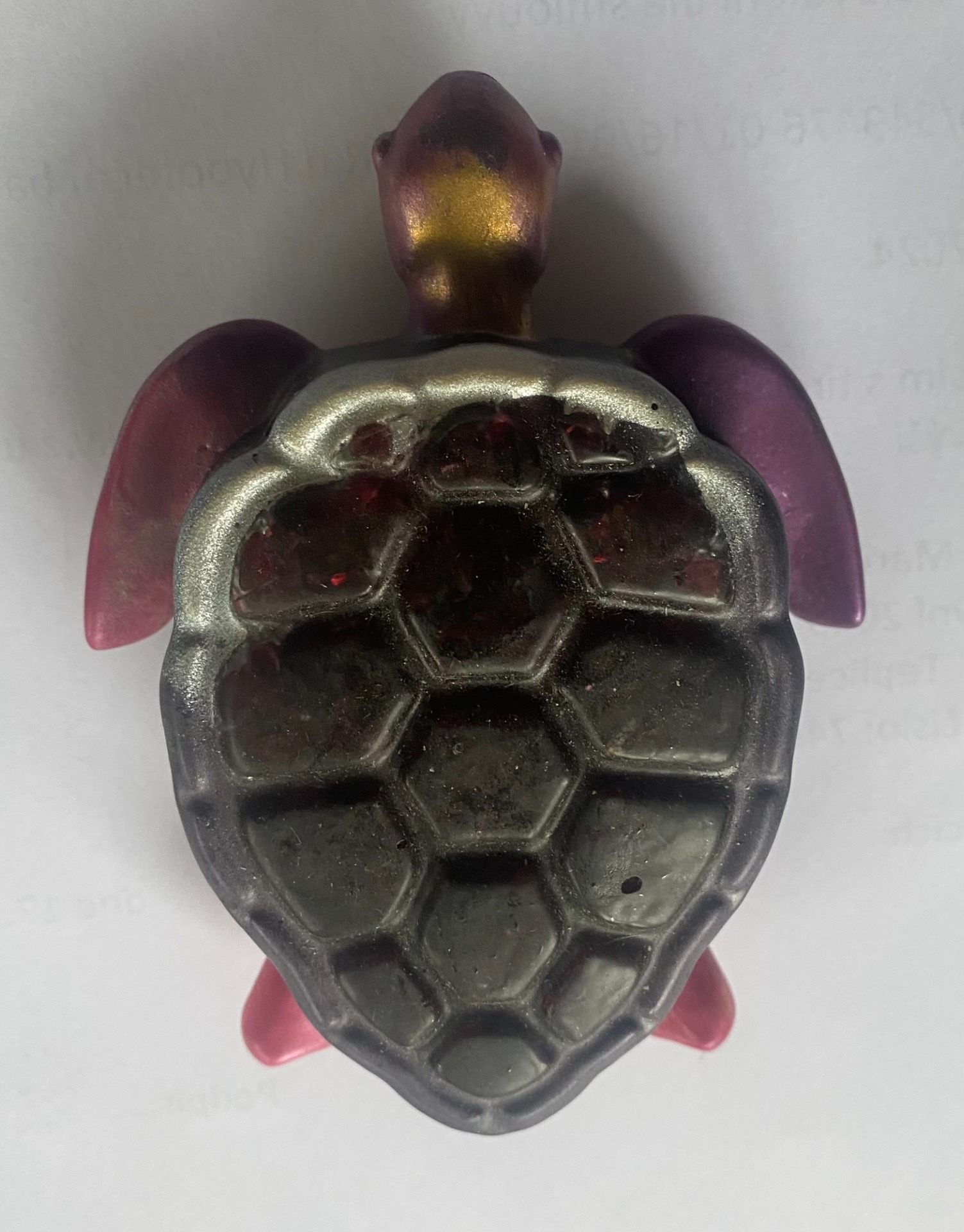 vyrobena z probarvené pryskyřice ve fialové, růžové, zlaté a černobílé