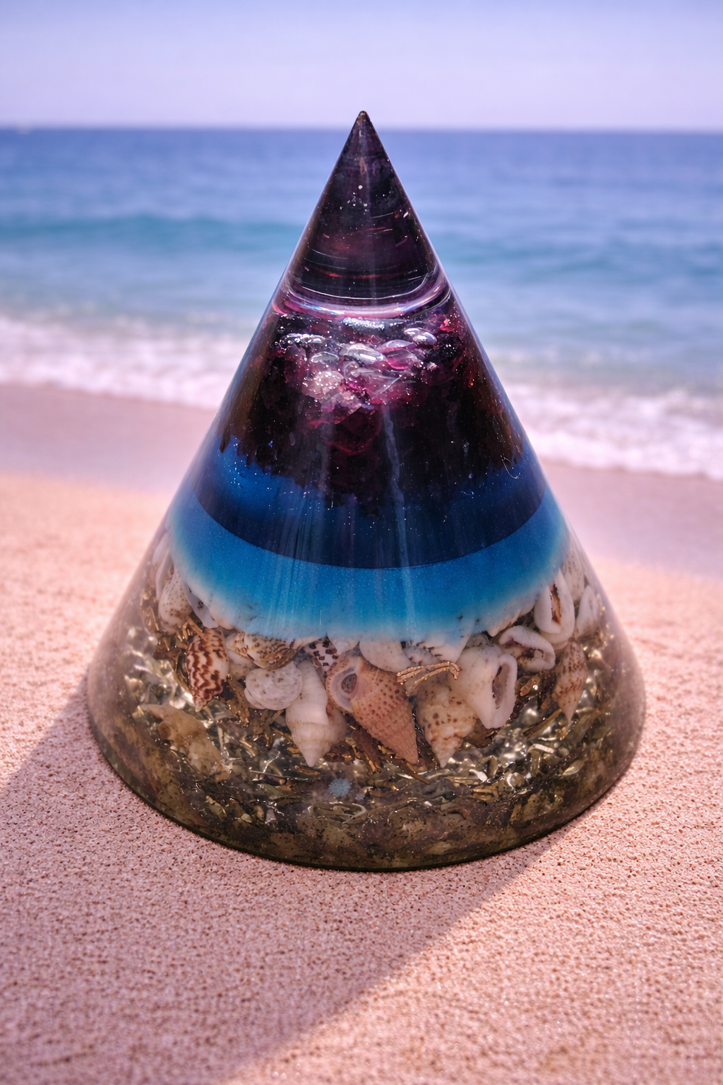 je sestaven jako orgonit, má dosah ochrany a očisty 6 metrů.