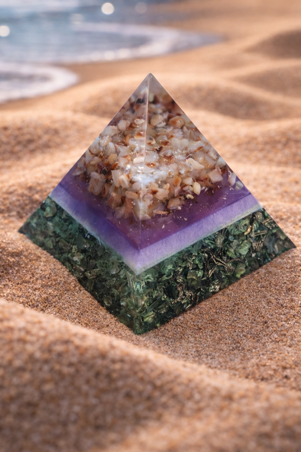 Pyramida je sestavená z karneolu , olivínu a křišťálu. Karneol je čistě přírodní minerál pocházející z Malawi, olivín je čistě přírodní minerál pocházející ze Srí Lanky, křišťál je čistě přírodní pocházející z Brazílie. Kovové špony přidány pro tříštění negativní energie. Částečně je pryskyřice obarvená bílofialovým pruhem. Jedná se o orgonit, síla ochrany a očisty je 5 metrů v kruhu. Obsahuje UV pryskyřici. Pyramida váží cca 76 g, výška pyramidy je cca 4,9 cm, a široká je cca 4,8 cm. Ručně vyrobená. Nevystavujte přímému slunci.