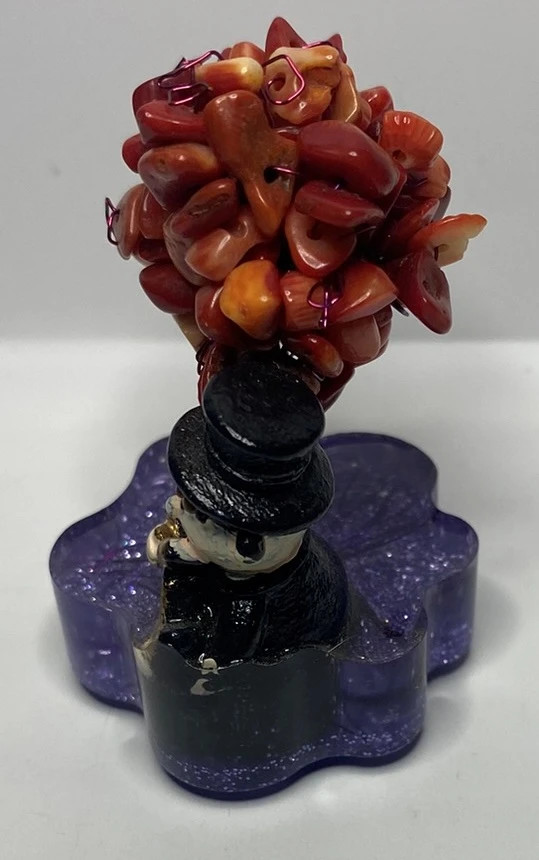 základna: psí packa z křišťálové pryskyřice a třpytek, vložený kominíček