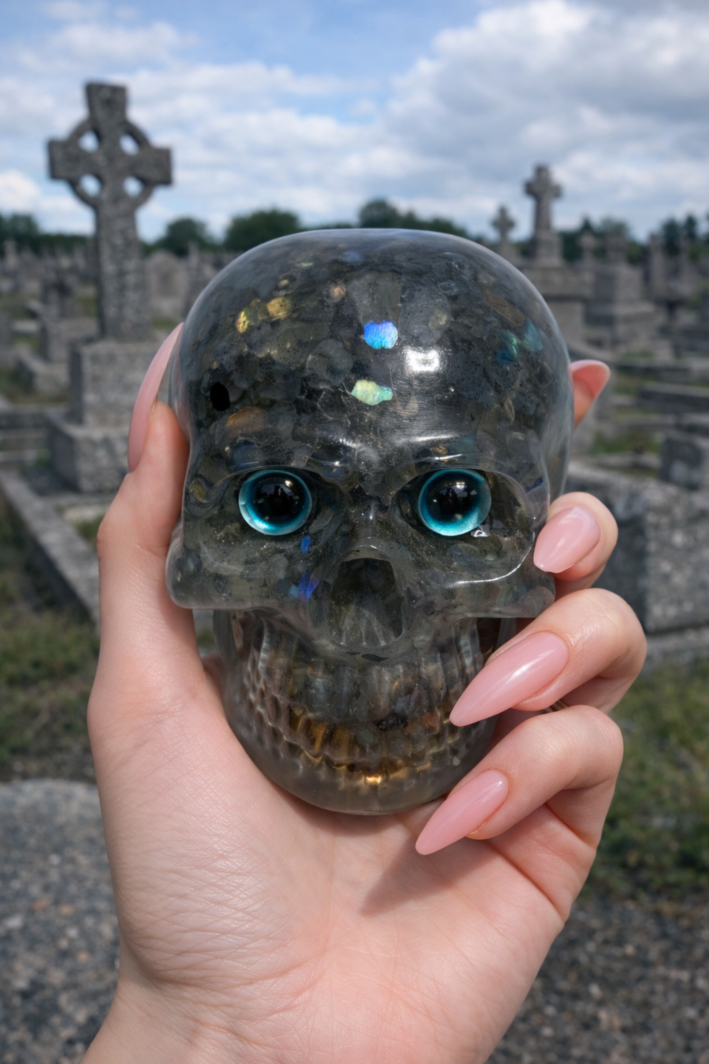 pryskyřice Resin Italy. Lebka je sestavena jako orgonit, má dosah ochrany a očisty