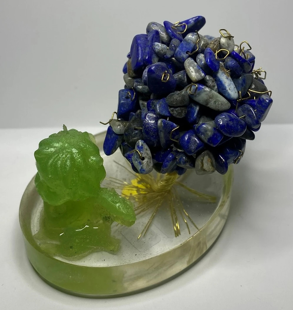 Minerály v koruně: lazurity vpletené do koruny stromu, o velikosti XS (do 1 cm),