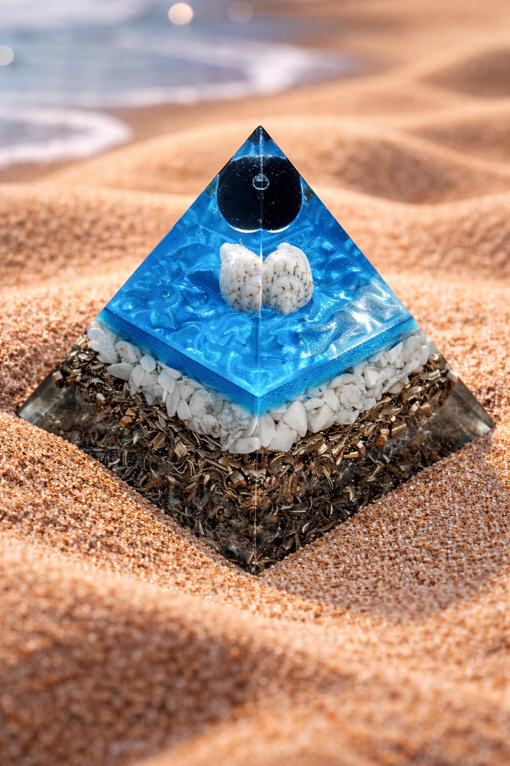 Pyramida je sestavená z magnezitu, onyxu, mušle a křišťálu. Magnezit je přírodní přibarvený minerál pocházející ze Zimbabwe, onyx je čistě přírodní minerál pocházející z Indie, mušle z Karibiku, křišťál je čistě přírodní pocházející z Brazílie. Kovové špony přidány pro tříštění negativní energie. Jedná se o orgonit, síla ochrany a očisty je 5 metrů v kruhu. Obsahuje UV pryskyřici. Pyramida váží cca 70 g, výška pyramidy je cca 5 cm, a široká je cca 4,8 cm. Ručně vyrobená. Nevystavujte přímému slunci.