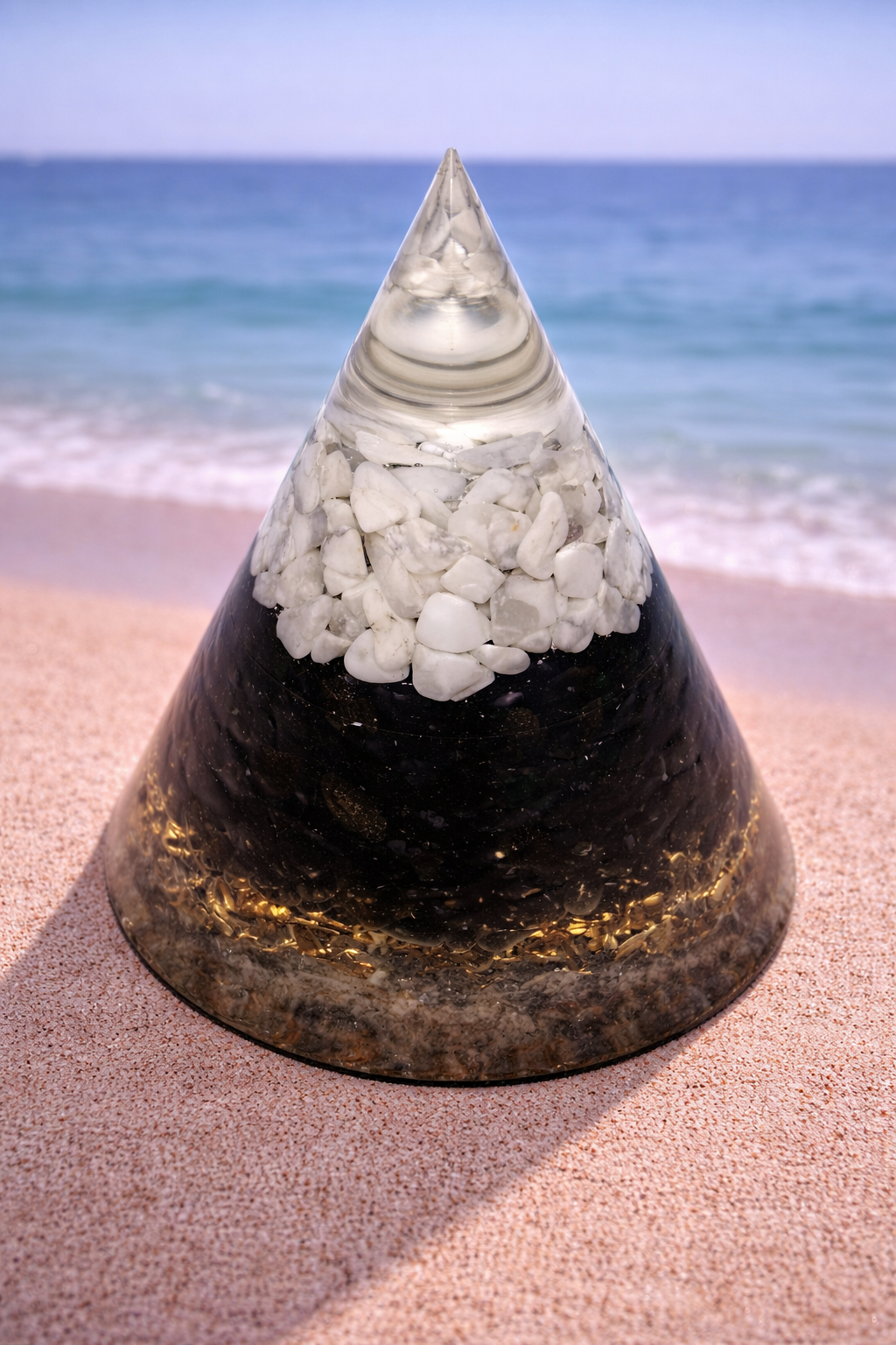 je sestaven jako orgonit, má dosah ochrany a očisty 5 metrů.