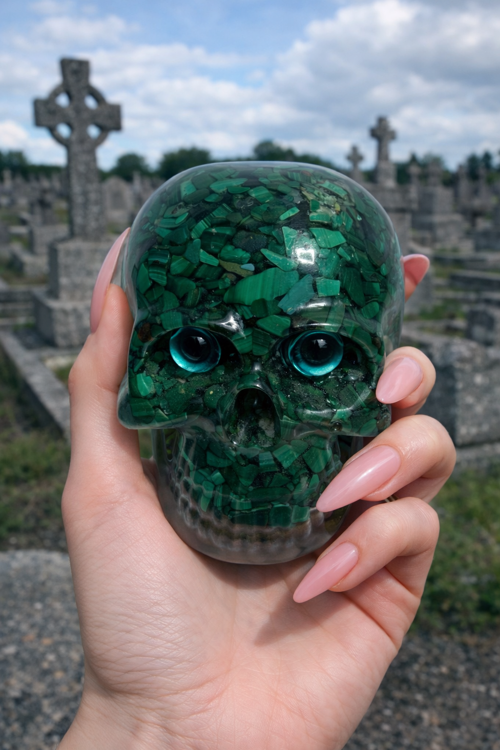pryskyřice Resin Italy. Lebka je sestavena jako orgonit, má dosah ochrany a