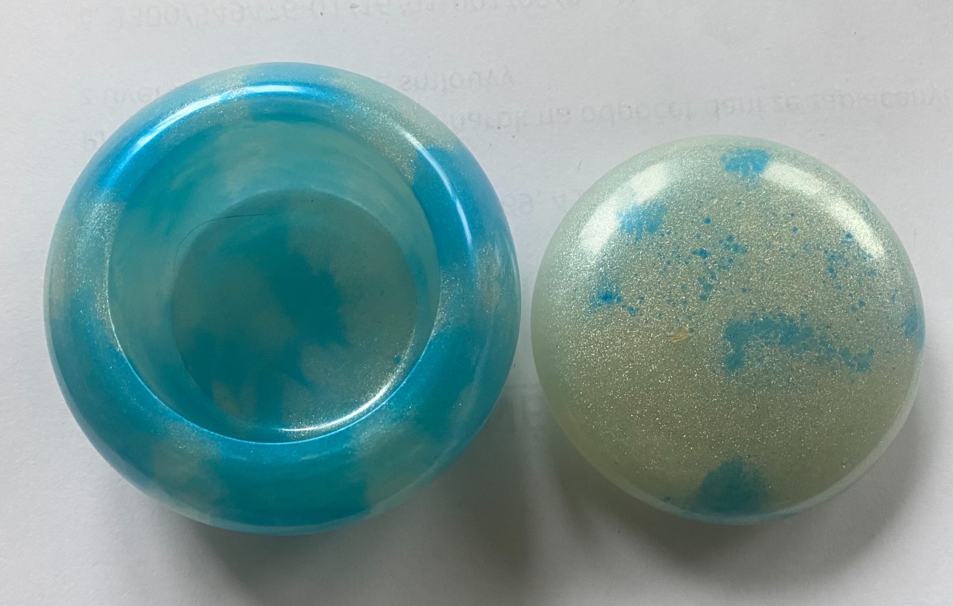 díl i víčko) je vyrobena z probarvené pryskyřice v modrobílé barvě, bez minerálů.
