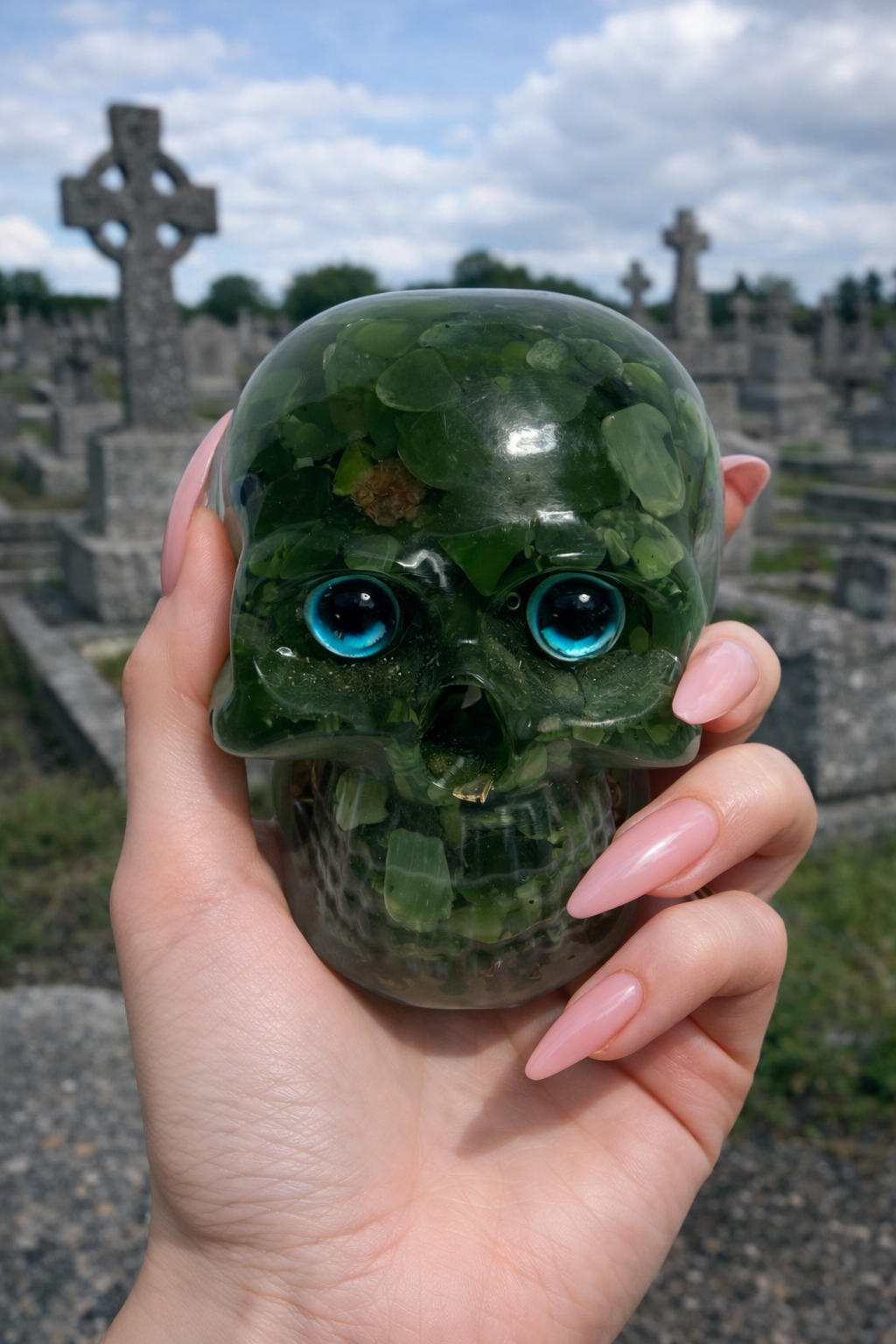 pryskyřice Resin Italy. Lebka je sestavena jako orgonit, má dosah ochrany a