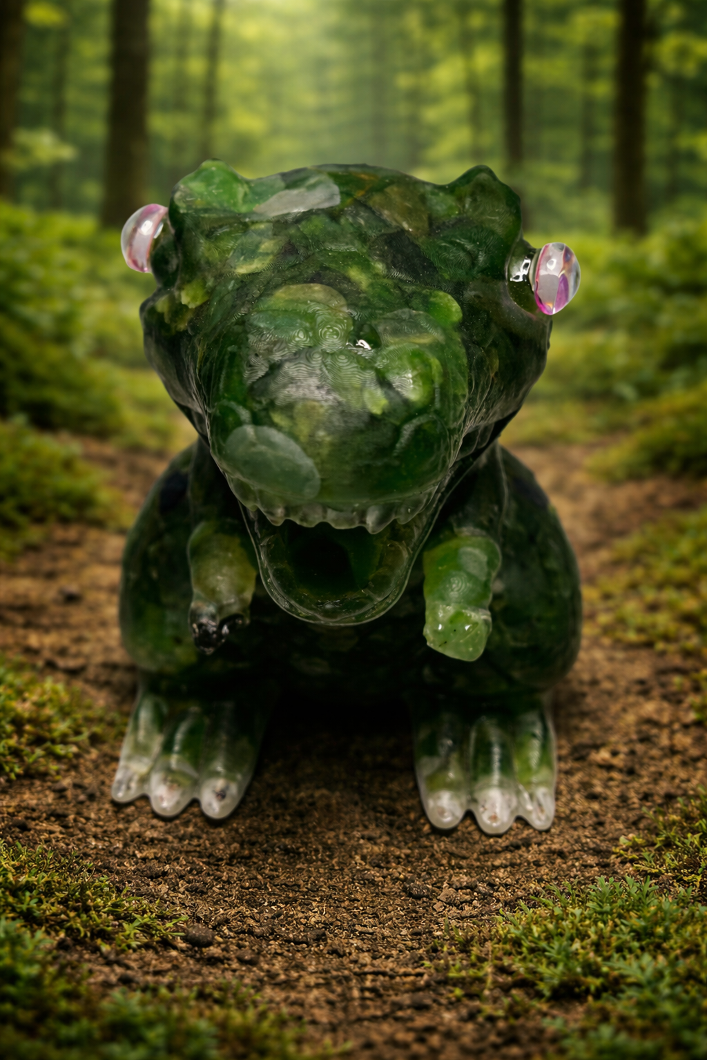 z pryskyřice, minerálů a akrylových očí. Akryl vytváří čistší barvy, proto