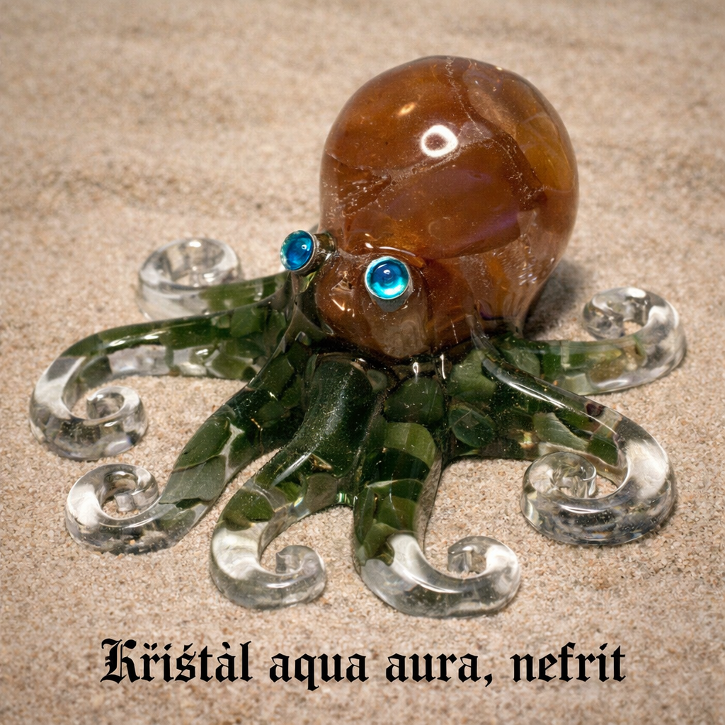 Chobotnice je sestavená z nefritu a křišťálu aqua aura zlatého. Nefrit je čistě přírodní, pochází z Kanady, křišťál čistě přírodní pocházející z Brazílie. Kovové špony přidány pro tříštění negativní energie. Jedná se o plnohodnotný orgonit, síla ochrany a očisty je 10 metrů v kruhu. Chobotnice má akrylové oči. Zalitá je v UV pryskyřici. Chobotnice váží cca 128 g, výška chobotnice je cca 4,5 cm, a široká je cca 10,2 x 9,3 cm. Ručně vyrobená. Nevystavujte přímému slunci.