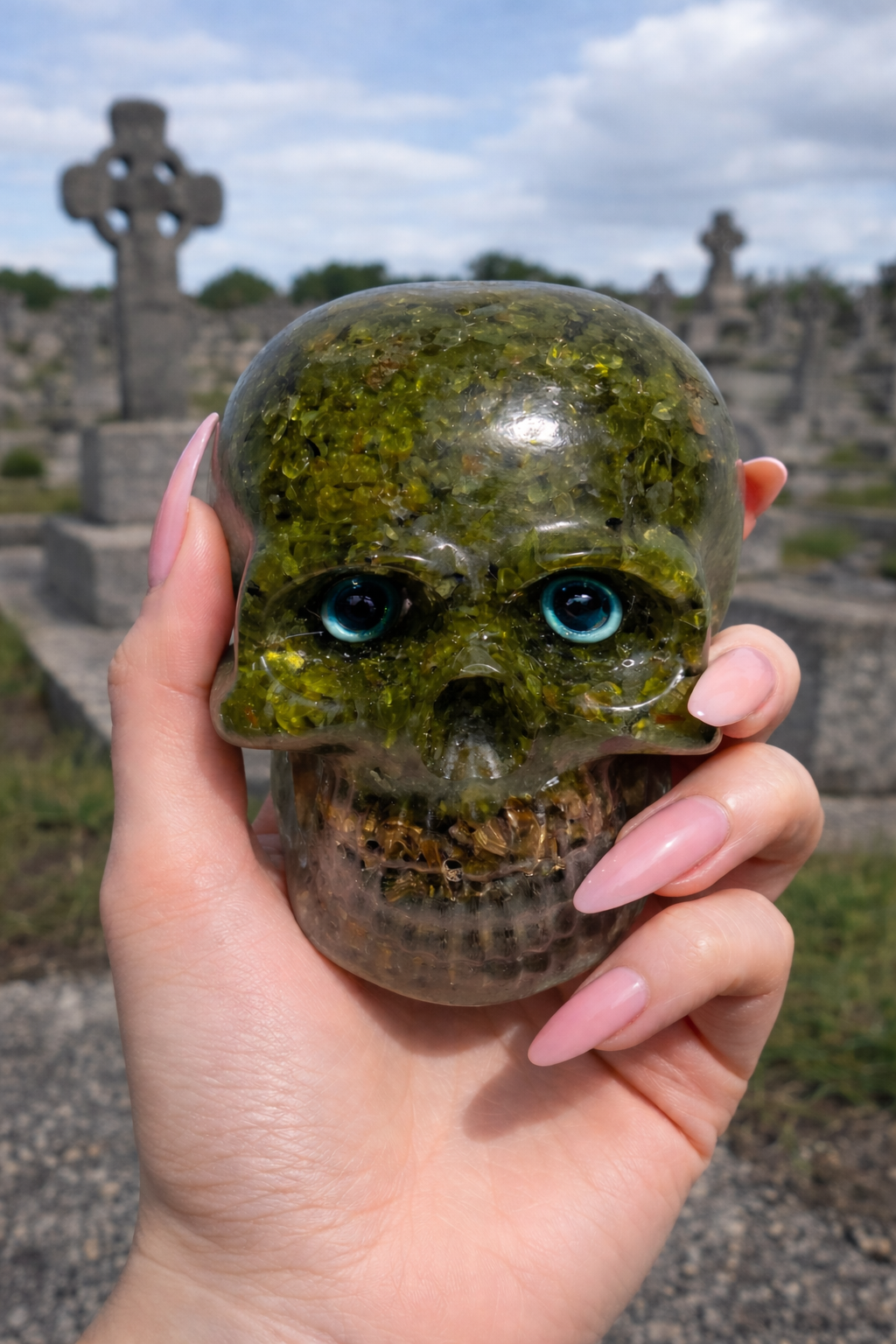 pryskyřice Resin Italy. Lebka je sestavena jako orgonit, má dosah ochrany a