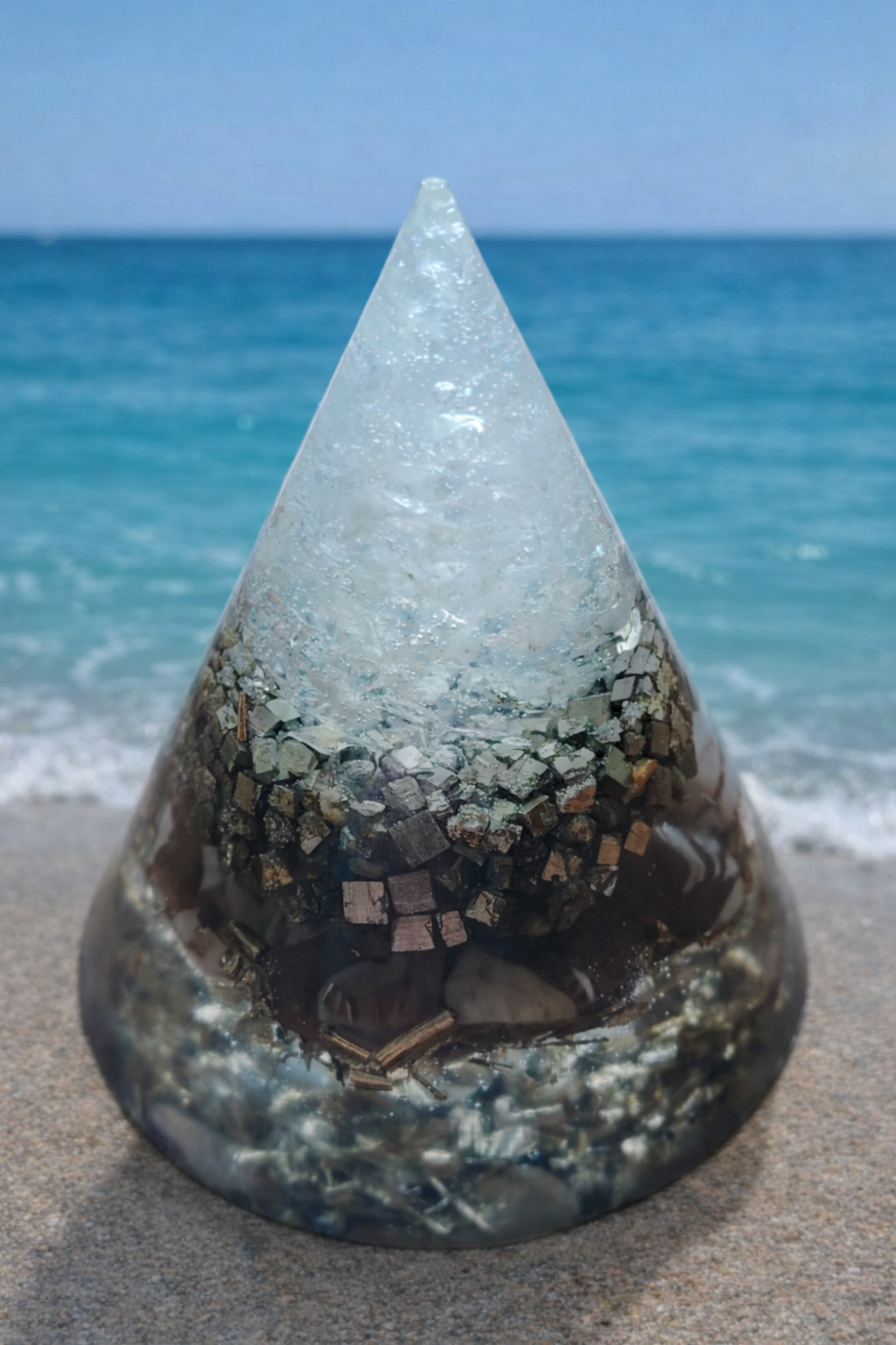 je sestaven jako orgonit, má dosah ochrany a očisty 6 metrů.