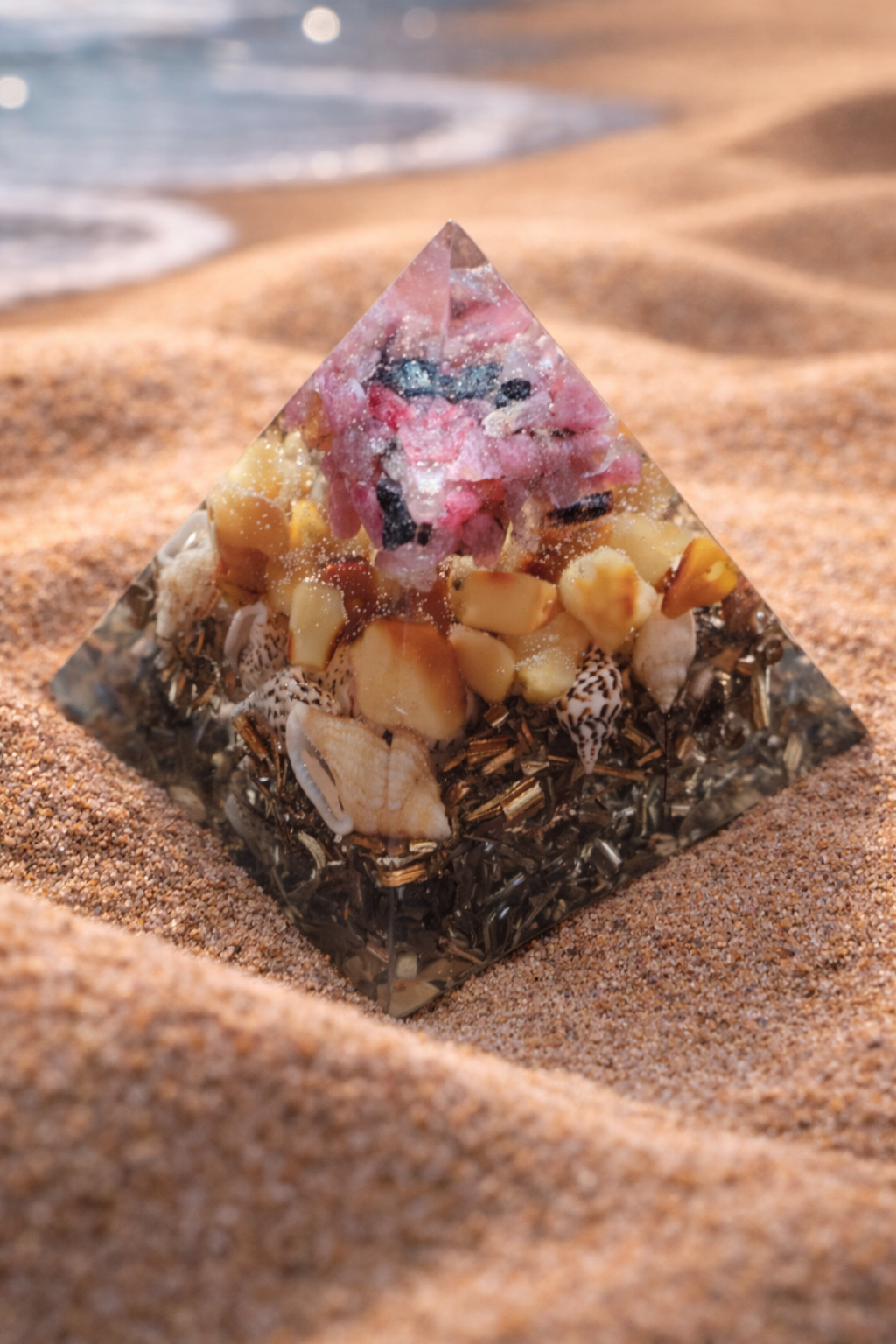Pyramida je sestavená z rodonitu, jantaru, mušlí a křišťálu. Rodonit je čistě přírodní minerál pocházející ze Zimbabwe, jantar je čistě přírodní fosilní pryskyřice pocházející z Uralu, pravé mořské mušle z Karibiku, křišťál je čistě přírodní pocházející z Brazílie. Kovové špony přidány pro tříštění negativní energie. Jedná se o orgonit, síla ochrany a očisty je 5 metrů v kruhu. Obsahuje UV pryskyřici. Pyramida váží cca 52 g, výška pyramidy je cca 4,6 cm, a široká je cca 4,7 cm. Ručně vyrobená. Nevystavujte přímému slunci.