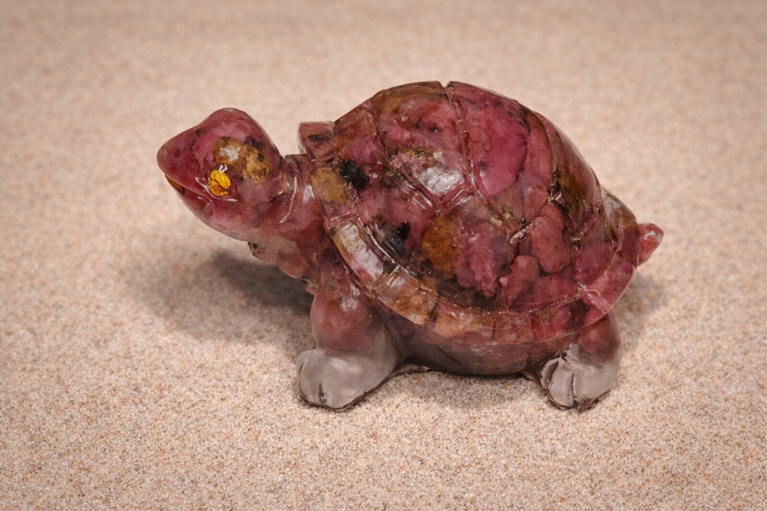 minerálů a štrasových očí. Oči jsou ze štrasových korálků. Pryskyřici volím z