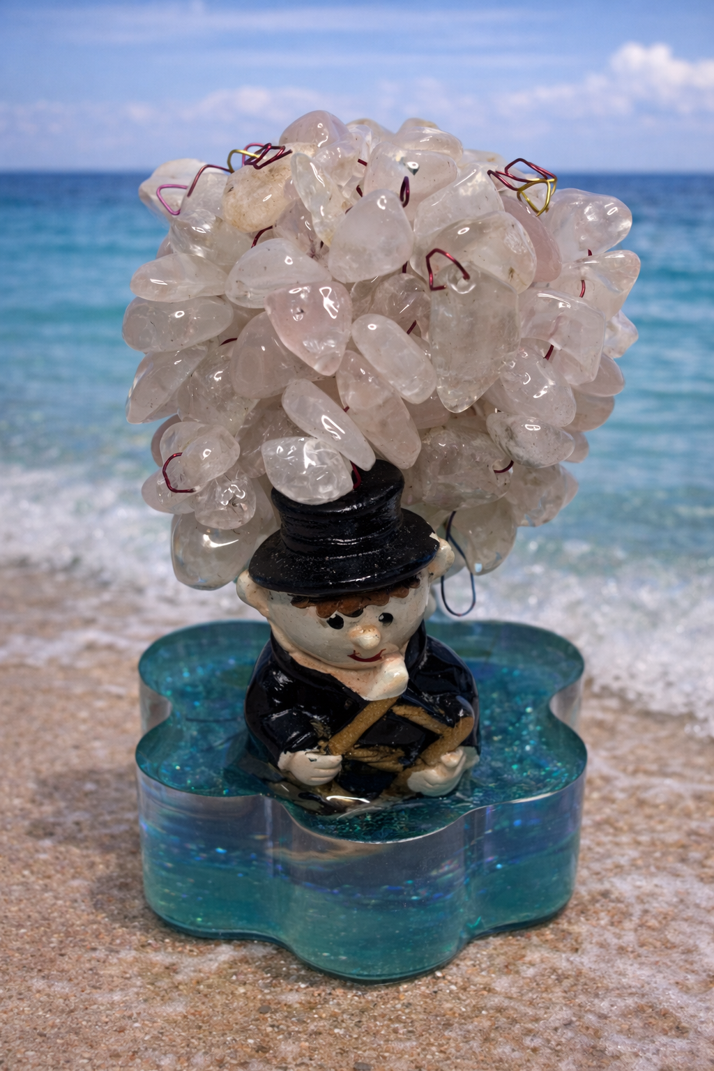 Minerály v koruně: růženíny vpletené do koruny stromu, o velikosti XS