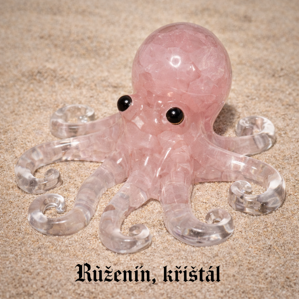 Chobotnice je sestavená z růženínu a křišťálu, přidaná růžová barva. Růženín je čistě přírodní, pochází z Brazílie, křišťál čistě přírodní pocházející z Brazílie. Kovové špony přidány pro tříštění negativní energie. Jedná se o plnohodnotný orgonit, síla ochrany a očisty je 10 metrů v kruhu. Chobotnice má akrylové oči. Zalitá je v UV pryskyřici. Chobotnice váží cca 114 g, výška chobotnice je cca 4,5 cm, a široká je cca 10,2 x 9,3 cm. Ručně vyrobená. Nevystavujte přímému slunci.
