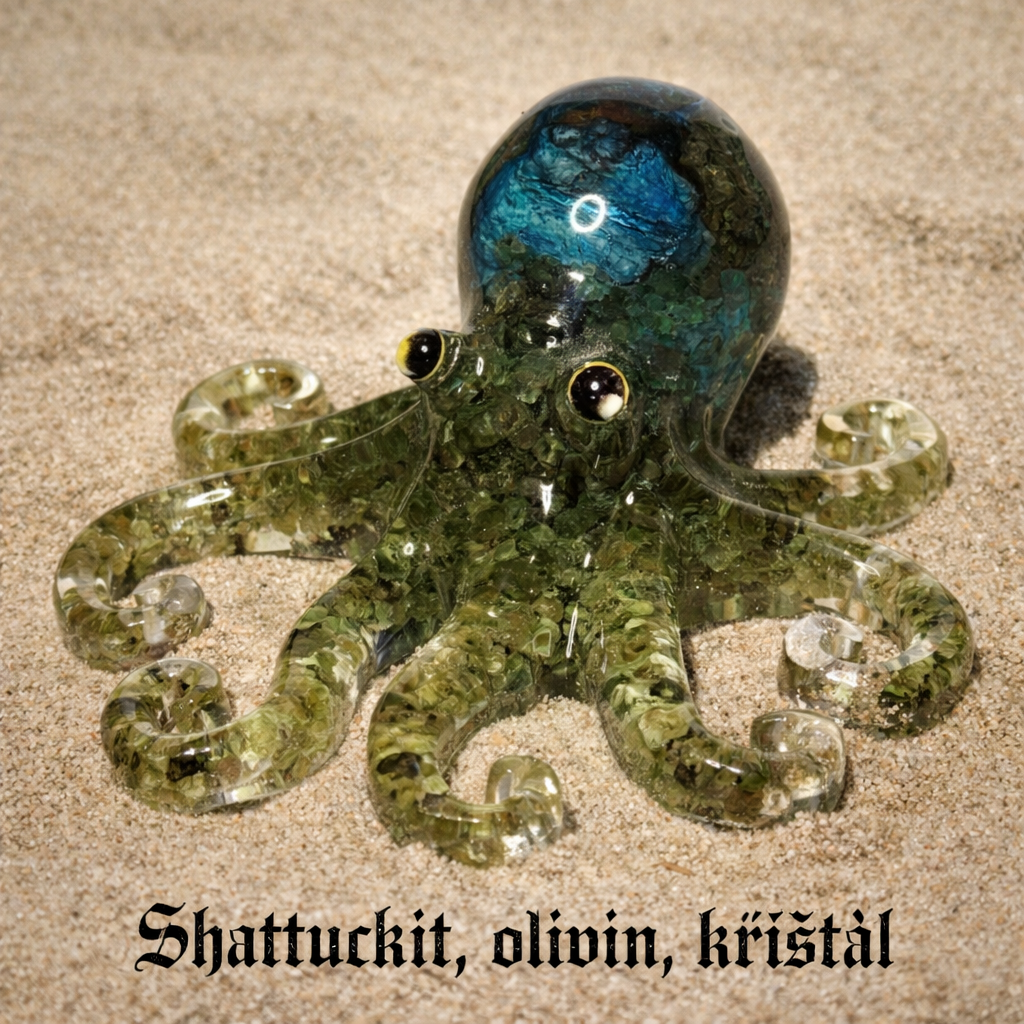 Chobotnice je sestavená ze shattuckitu, olivínu a křišťálu. Shattuckit je čistě přírodní, pochází z Konga, olivín čistě přírodní pochází ze Srí Lanky, křišťál čistě přírodní pocházející z Brazílie. Chobotnice má akrylové oči. Zalitá je v UV pryskyřici. Chobotnice váží cca 149 g, výška chobotnice je cca 4,5 cm, a široká je cca 10,2 x 9,3 cm. Ručně vyrobená. Nevystavujte přímému slunci.