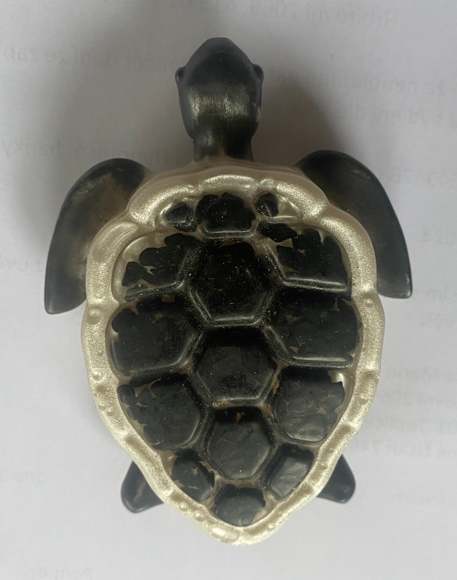 Horní víčko krabičky je z turmalínu černého a probarvené pryskyřice