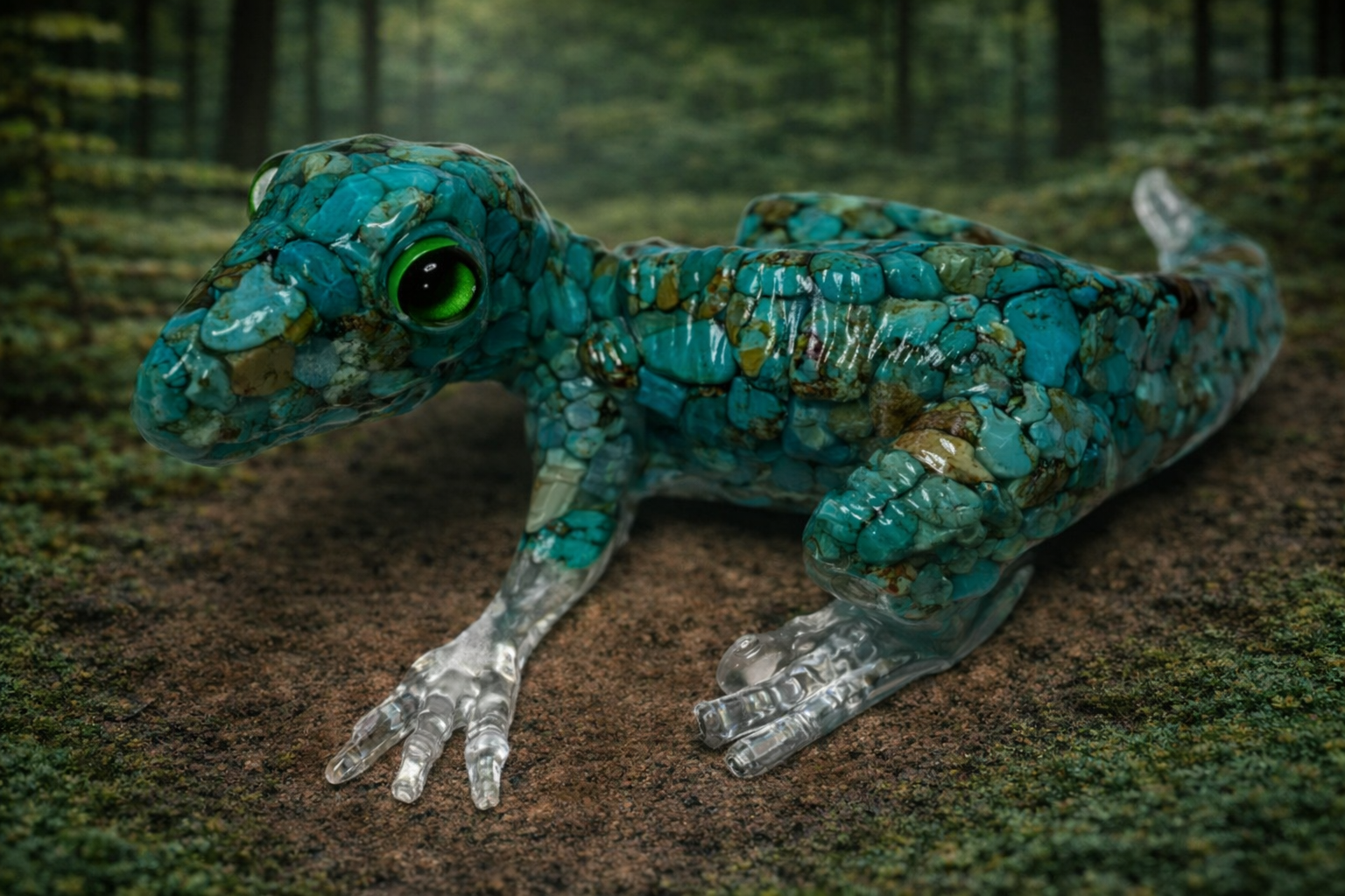 z pryskyřice, minerálů a akrylových očí. Akryl vytváří čistší barvy, proto