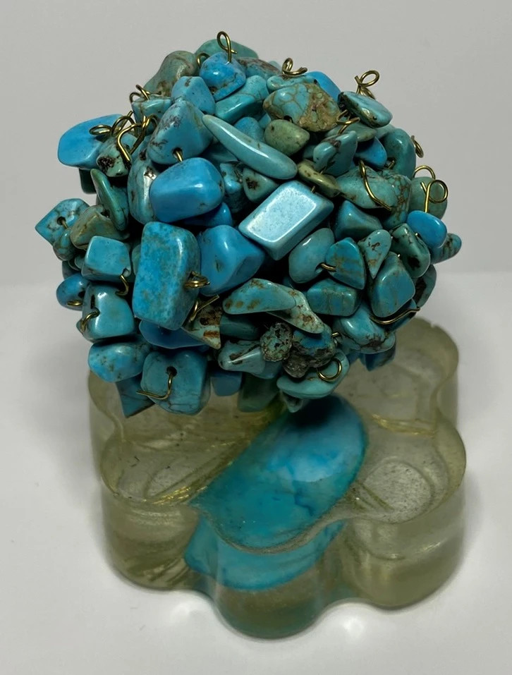 Minerály v koruně: tyrkenity modré howlity vpletené do koruny stromu, o velikosti XS