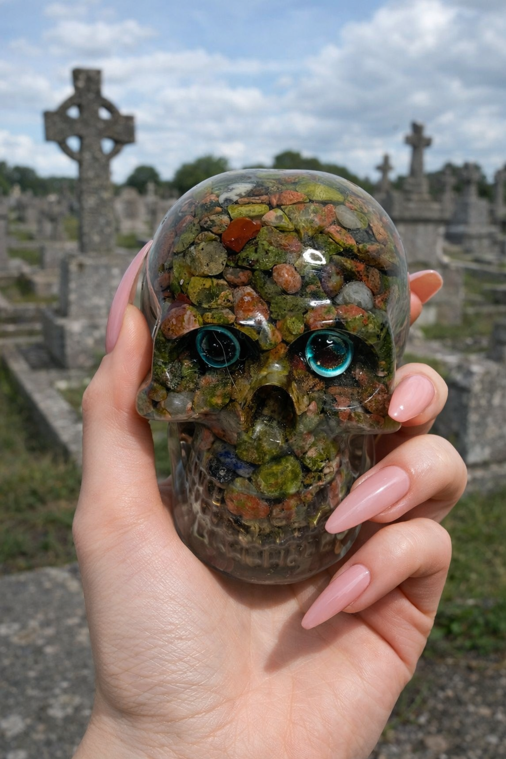 pryskyřice Resin Italy. Lebka je sestavena jako orgonit, má dosah ochrany a