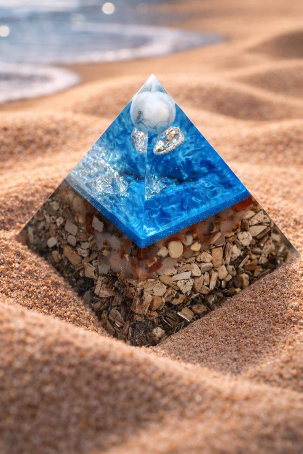 Pyramida je sestavená z magnezitu, karneolu, jaspisu, mušlí a křišťálu. Magnezit je čistě přírodní minerál pocházející ze Zimbabwe, karneol je čistě přírodní minerál pocházející z Malawi, jaspis obrázkový je čistě přírodní minerál pocházející z Namíbie, mušle z Karibiku, křišťál je čistě přírodní pocházející z Brazílie. Kovové špony přidány pro tříštění negativní energie. Jedná se o orgonit, síla ochrany a očisty je 6 metrů v kruhu. Obsahuje UV pryskyřici. Pyramida váží cca 117 g, výška pyramidy je cca 6,1 cm, a široká je cca 5,9 cm. Ručně vyrobená. Nevystavujte přímému slunci.