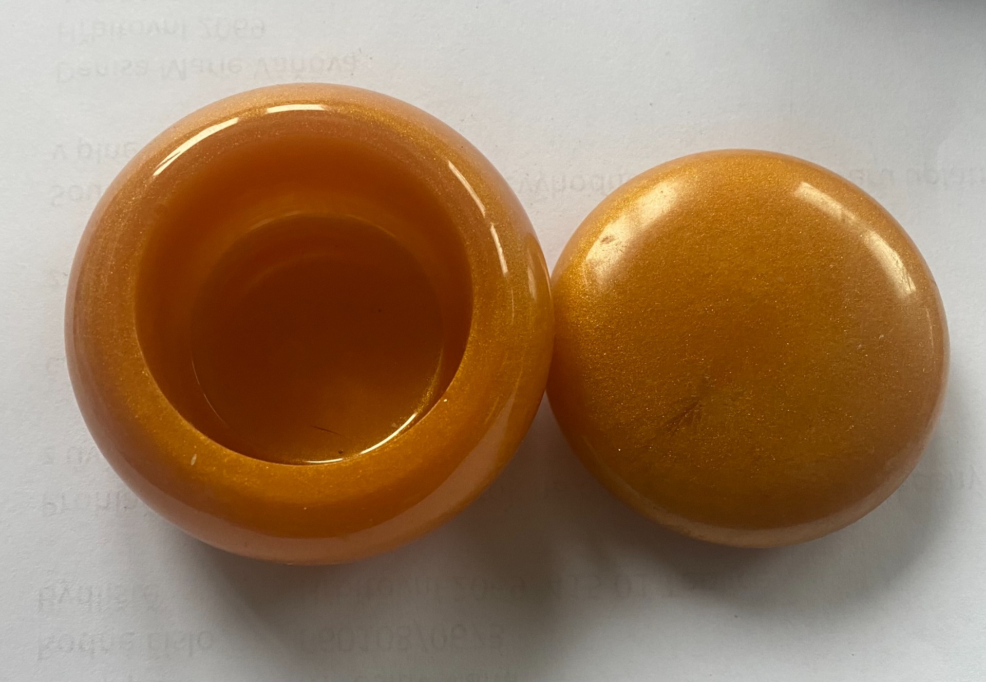 díl i víčko) je vyrobena z probarvené pryskyřice ve zlaté barvě, bez minerálů.